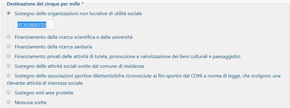 - apporre la firma nel riquadro ed indicare anche il codice fiscale del soggetto cui vuole destinare direttamente la quota del cinque per mille dell’Irpef.