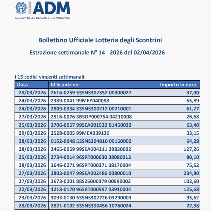 I codici vincenti dell’estrazione Lotteria degli Scontrini del 2 Aprile 2026