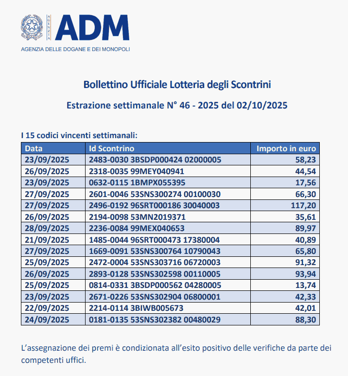- I Premi Settimanali da 25mila Euro del 2 Ottobre 2025: lotteria scontrini