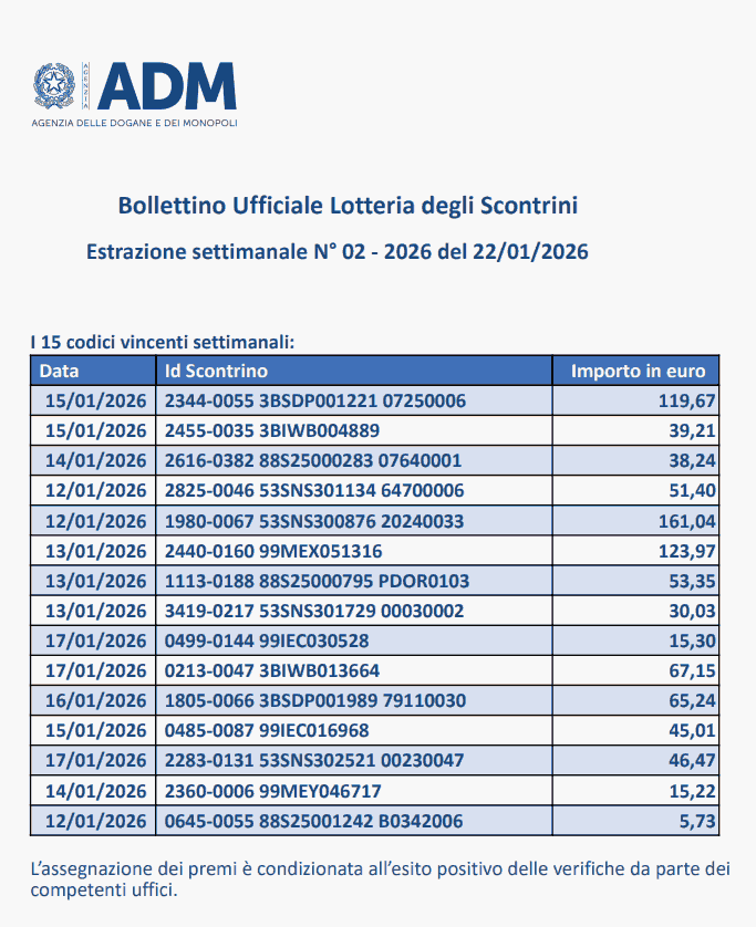 - I Premi Settimanali da 25mila Euro del 22 Gennaio 2026: lotteria scontrini