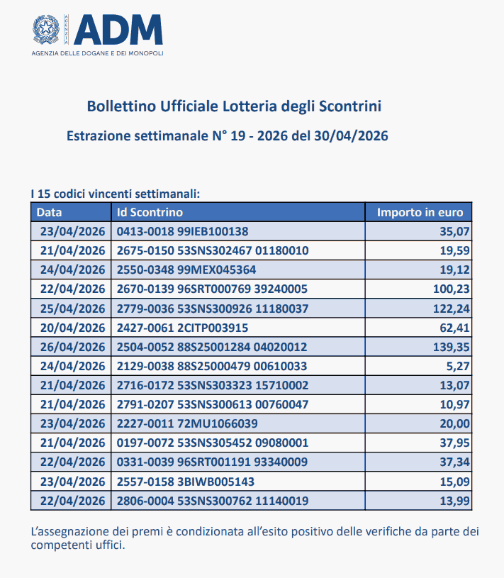 - I Premi Settimanali da 25mila Euro del 30 Aprile 2026: lotteria scontrini