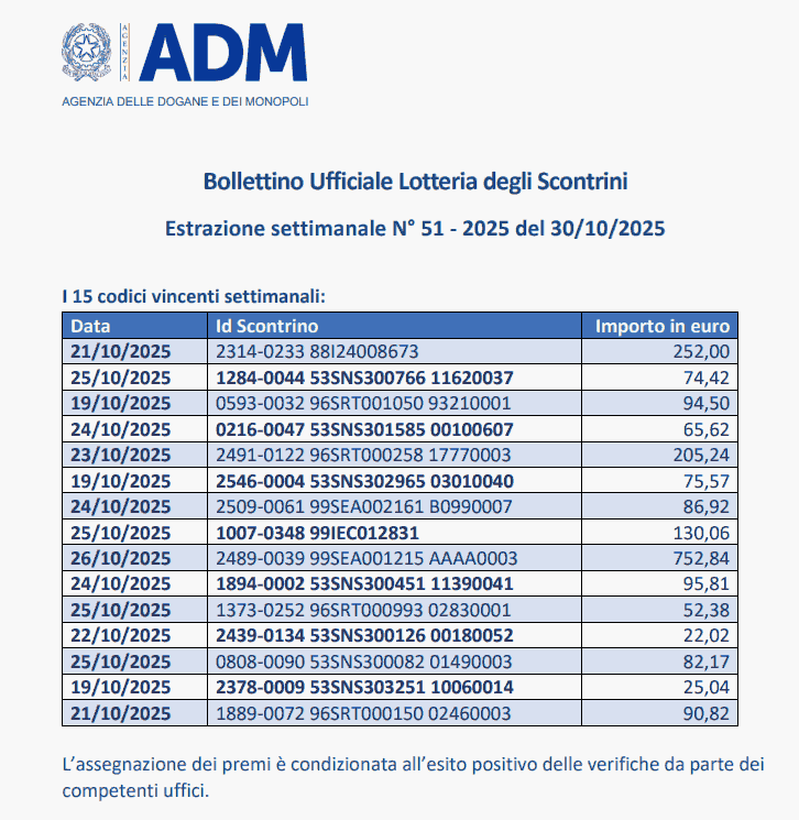 Quali sono gli Scontrini Vincenti dell’Estrazione del 30 Ottobre 2025? Chi ha vinto i tanto attesi Premi? Si tratta di un quesito molto frequente fra tutti i consumatori che hanno generato dei codici-gioco per la Lotteria degli Scontrini.