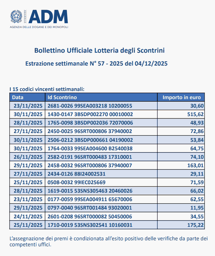 I codici vincenti dell’estrazione Lotteria degli Scontrini del 4 Dicembre 2025