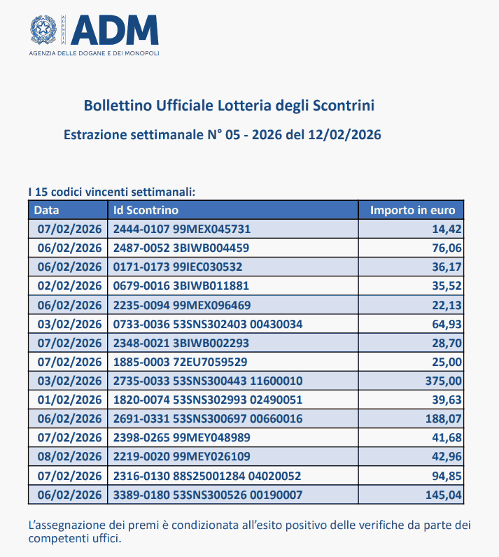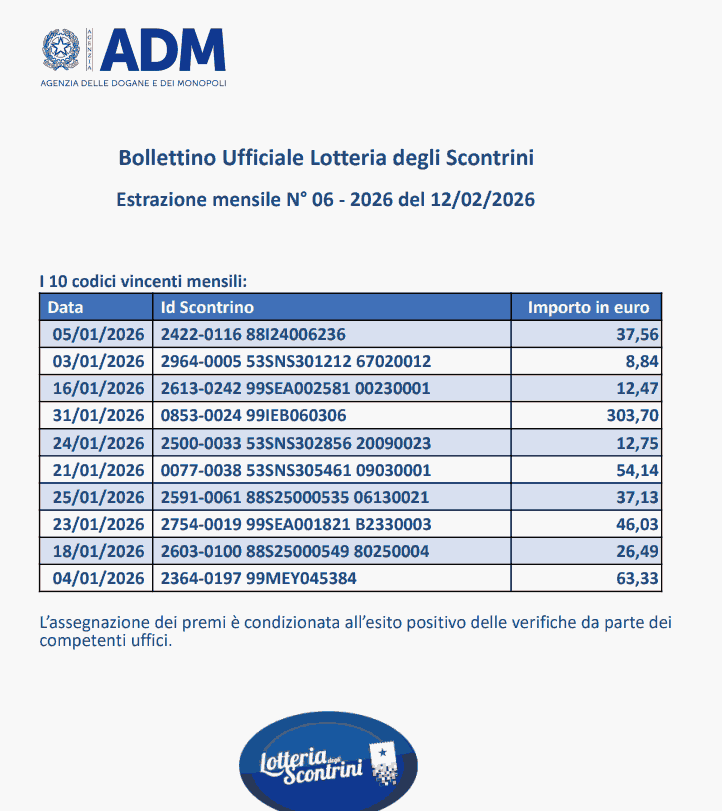 - I Premi Settimanali e Mensili da 100mila Euro del 12 Febbraio 2026: lotteria scontrini