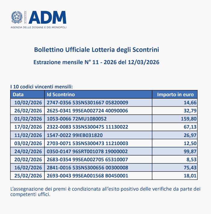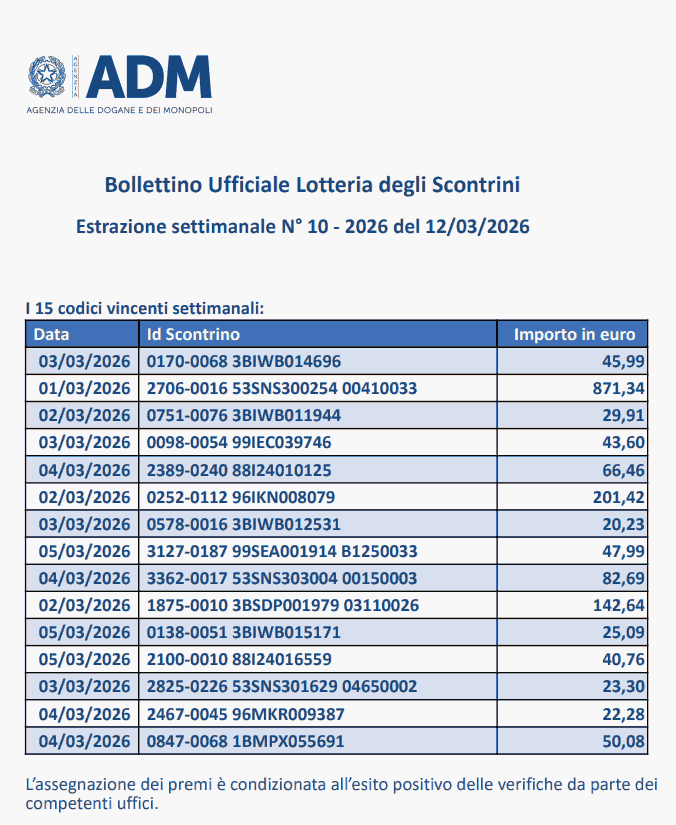 - I Premi Settimanali e Mensili da 100mila Euro del 12 Marzo 2026: lotteria scontrini