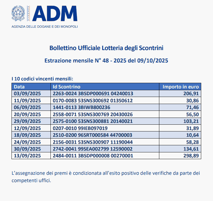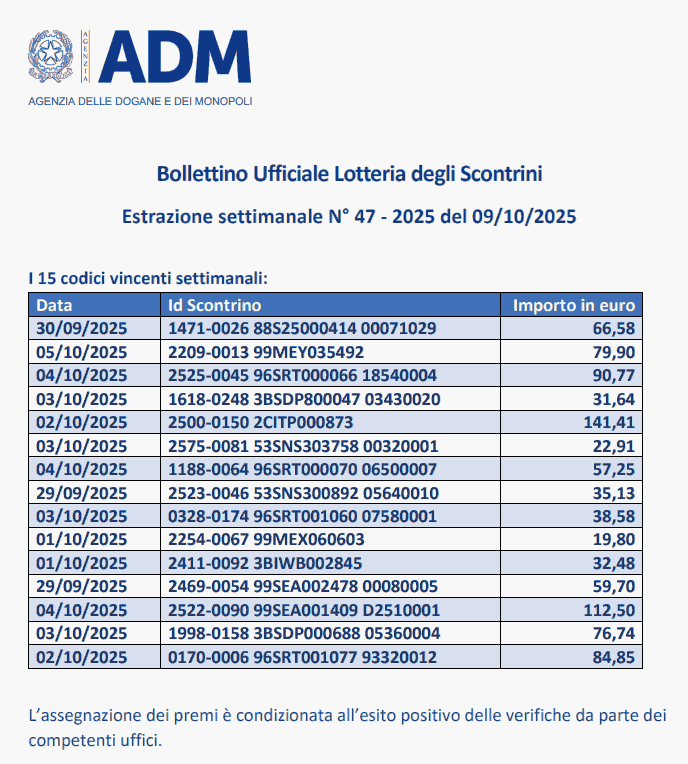 - I Premi Settimanali e Mensili da 100mila Euro del 9 Ottobre 2025: lotteria scontrini